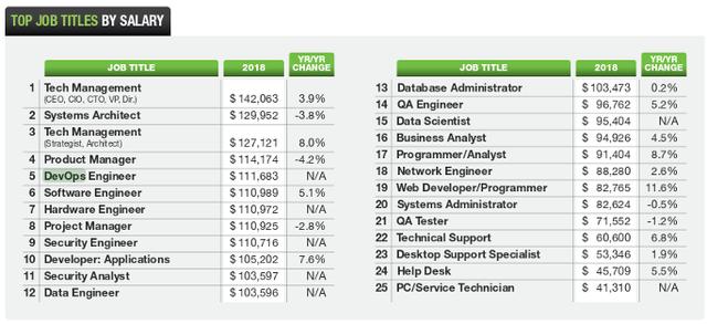 La rémunération des DevOps est donc supérieure au salaire Tech US moyen (93 244 dollars en 2018, en hausse de 0,6% par rapport à 2017, mais en deçà de son niveau de 2015).