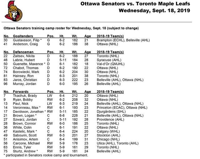 Both teams are set to play completely different rosters, with a handful more regulars expected to suit up on either side. For Ottawa, that includes young stars Thomas Chabot, Brady Tkachuk and Colin White, while their competition will include the likes of Auston Matthews, William Nylander and Morgan Rielly.