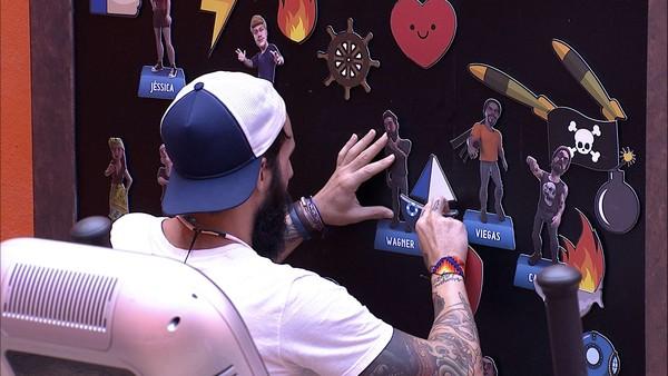 Wagner segue para a academia e observa o painel de avatares. O artista visual sorri para os desenhos e fala sozinho: "Da hora".