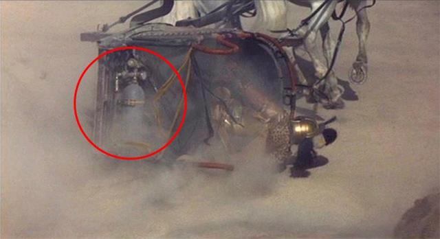 Na cena de uma batalha épica, uma das carruagens capota, e você pode ver um extintor amarrado na parte de trás dela.