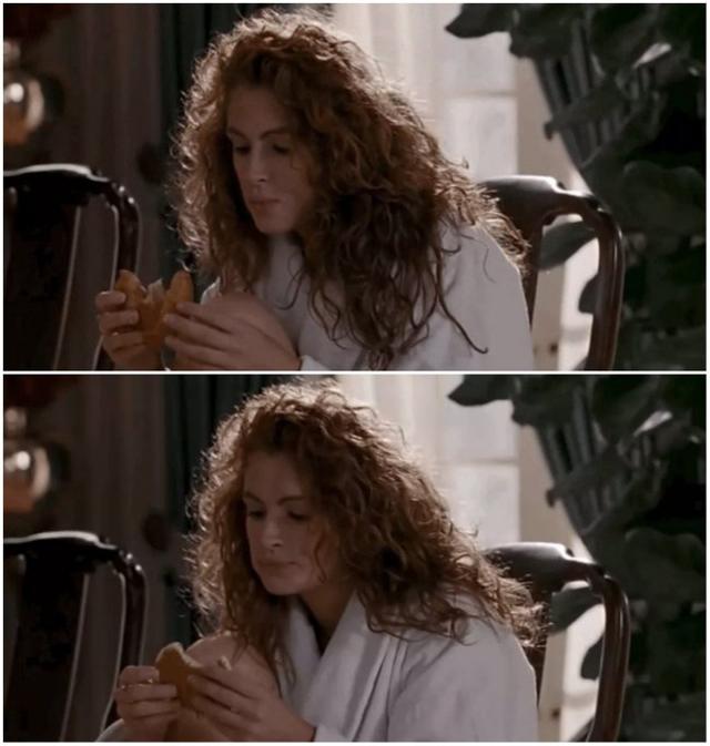 Neste cena, Julia Roberts está comendo um croissant, que no próximo frame de repente se transforma em panqueca.