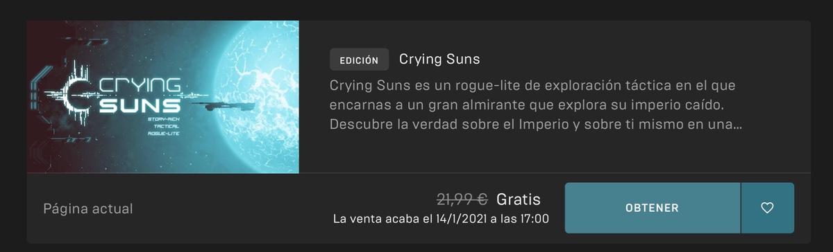 Este título nos propone averiguar la verdad de la caída del imperio en una historia inspirada en clásicos como Fundación de Isaac Asimov (de la que Apple está produciendo una serie), Battlestar Galáctica y Dune. Crying Suns tiene un precio habitual en la Epic Games Store de 21,99 euros, pero hasta el 14 de enero a las 5 de la tarde (hora española) podemos descargarlo de forma gratuita.