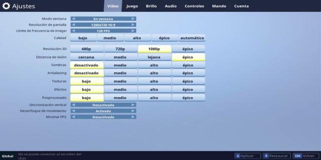 Una vez que has lanzado el juego, es conveniente ajustar los parámetros gráficos que te permite Fortnate en su configuración interna. Puedes reducir detalles, cambiar los FPS, o reducir la resolución de pantalla si ves que no va lo fluido que debiera.