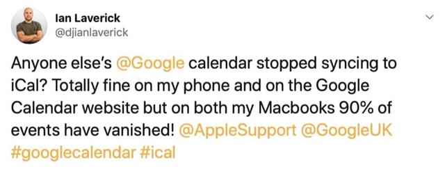 Twitter es una de las redes sociales donde los usuarios trasladan estas incidencias a los servicios técnicos. Por ejemplo, el usuario de Twitter, Ian Laverick. A este usuario le habían desaparecido el 90% de los eventos en sus MacBooks y lo había reportado a Google y al soporte de Apple. El usuario estaba relativamente tranquilo, pues sus eventos continuaban en la web de Google Calendar. Se trata por tanto de un problema con las sincronización de la información.