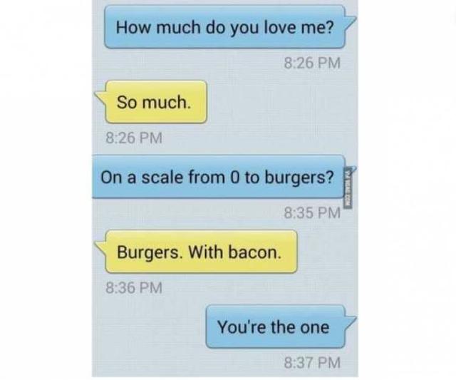 When two people in a relationship take the time with each other to speak a kind of language that is all their own, they are creating a unique bond that is totally unshakeable. Here this couple clearly loves burgers so much that they use it as a scale of how much they mean to each other.