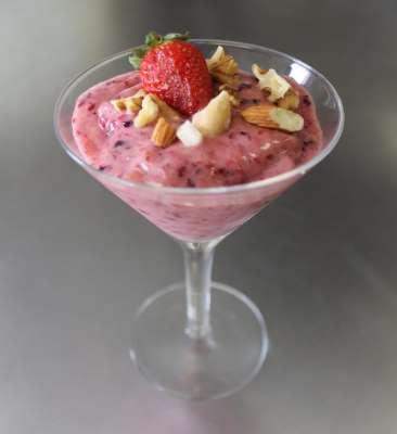 Em um processador ou mixer, coloque as bananas e as frutas vermelhas e bata até formar uma massa homogênea. Sirva em seguida com as castanhas picadas em cima.