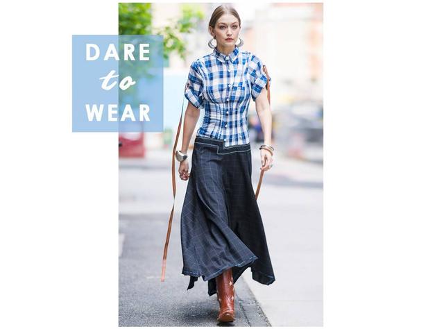 This week, the model was photographed in New York City wearing a blue plaid button-down, maxi denim skirt and Miron Crosby cowboy boots. She accessorized her look with wide silver hoops and bangles, keeping her hair and makeup minimal.