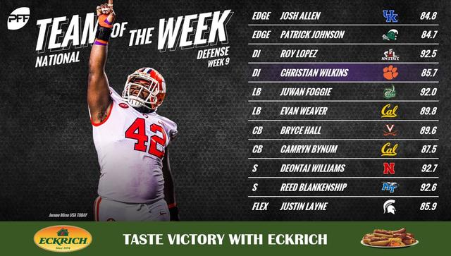 The college division of Pro Football Focus named Hall to their National Defense Team of the Week for his efforts.