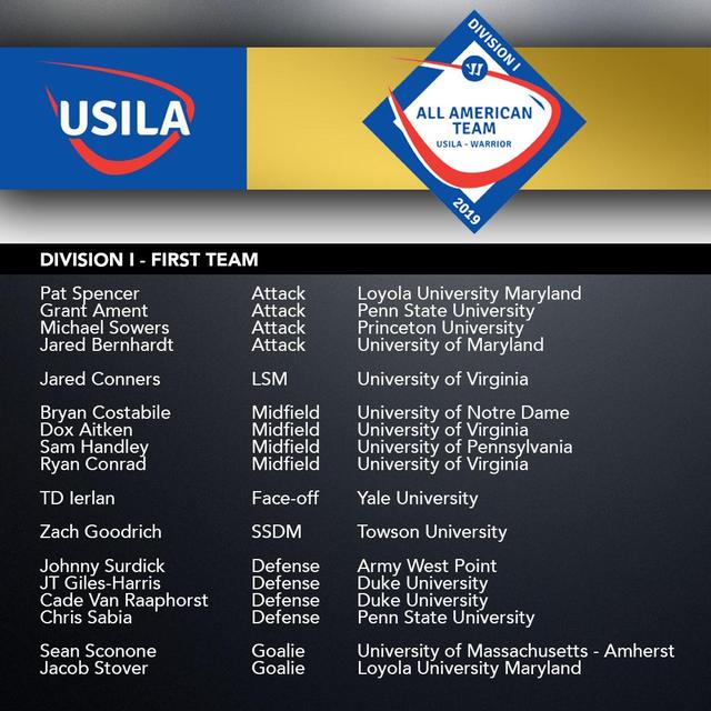 The Virginia Men’s Lacrosse team placed three players on the USILA All-American First Team and six total players were recognized as All-Americans. Jared Conners, Dox Aitken, and Ryan Conrad earned First Team honors, Michael Kraus landed on the third team, and Logan Greco and Matt Moore were named honorable mention.