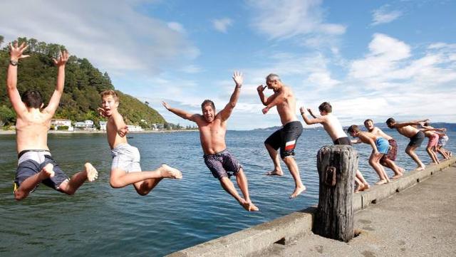 Wellesley School old boy Marc Ellis (centre) and Principal Warren Owen (to his right) jump off the Days Bay wharf to celebrate the school's centenary year. The wharf has always been popular with jumpers.