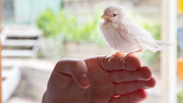 The sparrow which is pure white, with pink eyes and legs is in the capable hands of Robyn Chappell of Bird Rescue Cambridge.