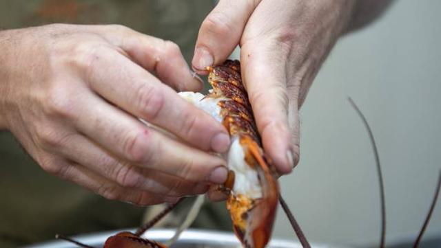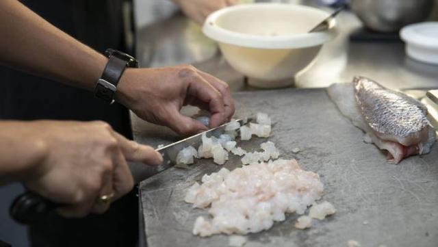 Roots Chef Giulio Sturla prepping some crayfish tails in the restaurant kitchen.