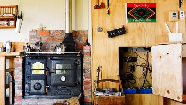 I got the Homewood stove brand new from a New Zealand company. It cost much more than the house, like, $8500. They're made for wood. If you tried to get a second-hand one, they're generally designed for coal. These have these lovely big wood boxes so you can chuck in some big logs. I get the wood from a local mate who sometimes rings me up and goes, "Bart! I think you might be due some wood." I got lucky finding him. I also cut some up from a willow patch down the back of the property.
