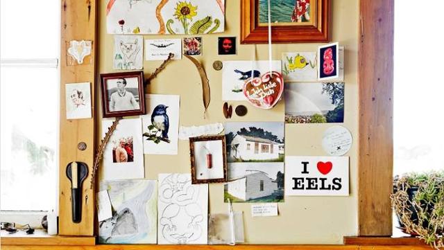 A pinboard in the kitchen highlights Bart's interests.