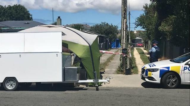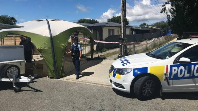 Police at the crime scene, a Lumsden Rd address in Akina, Hastings, on Friday.