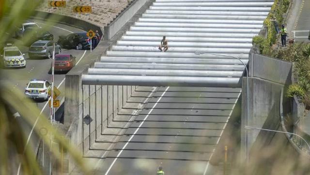 Double decker buses were brought in by police and parked underneath him to reduce the drop to the ground.
