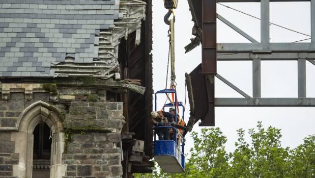 Two cranes are on the Cathedral Square site, allowing workers to remove the frame and rubble leaning up against it. They will also remove any loose roof slates that pose a fall hazard.