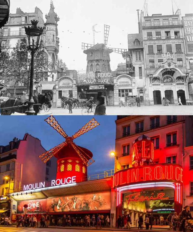 1. The Moulin Rouge cabaret in Paris, France during the 1950s and in 2018. This spot was where famous French artists, like Henri de Toulouse-Lautrec, the man who made their famous posters, according to The Guardian, frequented before it was accidentally burnt down in 1915. It was later rebuilt and revived as a club for entertainers during the 1920s and on, and hosted icons like Mistinguett, Edith Piaf and Charles Aznavour. Now it primarily serves as a tourist attraction, with extravagant shows filled with bright lights and costumes, that are open to the public.