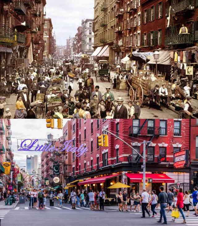 3. Mulberry Street, in New York City, USA from 1900 to 2014. This road is located in the centre of Little Italy, in Manhattan and has been a setting to many prominent events through history, as well as Mafia crimes, explains Lonely Planet. The sidewalks are no longer covered with carts and merchants, but with busy patios of popular restaurants.