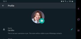Tap the hamburger menu icon at the top-right of the screen and select 'Settings'. Tap your profile name at the top of this menu and you get to the page that lets you alter your display image, the name your contacts will see and your profile 'About' blurb.