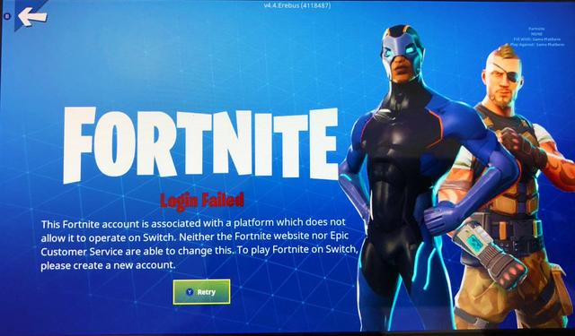 “This Fortnite account is associated with a platform which does not allow it to operate on Switch,” the screen reads. “Neither the Fortnite website nor Epic Customer Service are able to change this. To play Fortnite on Switch, please create a new account.”