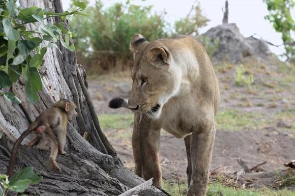 Segundo o usuário do Imgur que fez o upload da história, uma leoa atacou um grupo de babuínos e conseguiu pegar uma fêmea pelos dentes. Mas a leoa não sabia que o bebê do babuíno ainda estava agarrado ao seu corpo morto.