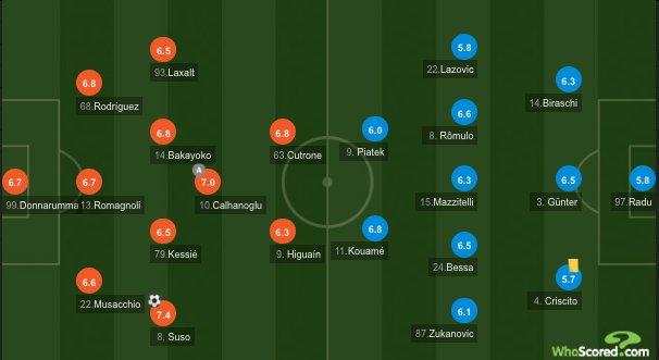 After the goal, Gattuso pulled Diego Laxalt and put on Ignazio Abate, reverting back to a 4-4-2 after playing something that resembled a 3-5-2.