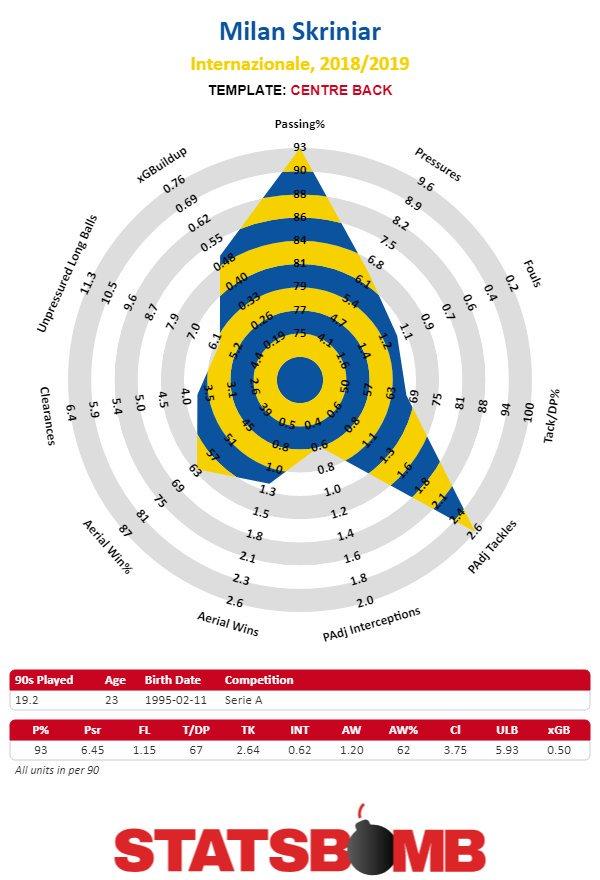 Inter has three high-quality center backs in Skriniar, De Vrij, and Godin. De Vrij may have had a down season, however, that is not indicative of his quality. In terms of rating the player, one down year should not define the ability of the player. Skriniar just turned twenty-four, he may still progress, however, he is hitting his physical peak very soon. Expect him to adapt with intelligence, which I think he does possess. If he can read the game better, then he will be able to stop attacks without making tackles. Skriniar still struggles with some ball playing issues at the back, especially under pressure. Juventus and Napoli would purposely press him when he had the ball because he struggles with passing out of danger. Skriniar has a high passing percentage but cannot break a press.