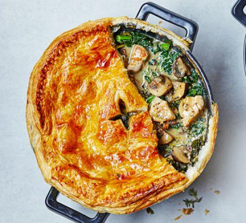 - Remove from the heat and cover with the puff pastry lid, pressing into the sides of the casserole dish. Slice a cross in the centre and glaze with the egg. Bake for 30 mins until the pastry is puffed up and golden.