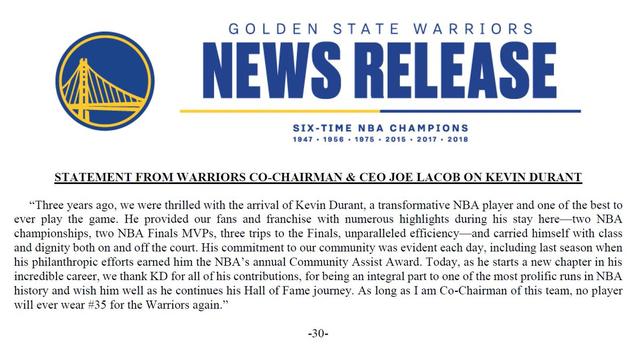 In the statement, Co-Chairman & CEO Joe Lacob also vowed that his No. 35 would not be worn by another Warrior as long as Lacob is in charge. According to the latest report from NBA Insider Shams Charania, the Warriors intend to permanently retire Durant’s number.