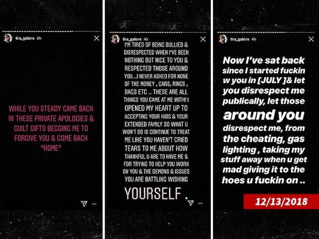In December 2018, Galore posted to Instagram regarding their relationship, writing that she was “tired of being bullied and disrespected” and that she “never asked for none of the money, cars, rings, bags” or gifts given to her from Thomas. In August of that year, Galore claims Thomas attempted to “make things right” between then by buying her a $50,000 SUV, only to break the driver-side window of said SUV during a violent altercation. A week later according to Galore, Thomas paid her $50,000 not to call the police and report the abuse.