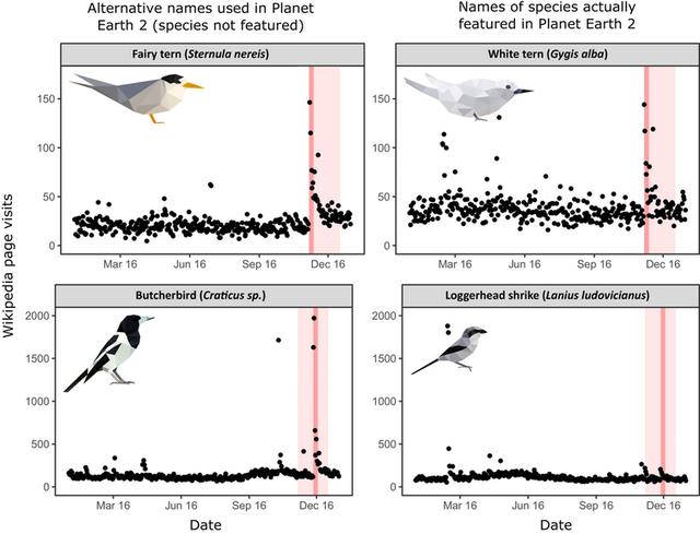 The Twitter data showed that audiences reacted to the species featured in nature documentaries, but in unexpected ways. Analysing Wikipedia activity, we found that almost half of the Planet Earth II species registered annual peaks in visits to their Wikipedia pages immediately after the show was broadcast. People were searching for information on the animals they had just seen and again, the species that got the most airtime also got the most visits on Wikipedia. Those same species still had higher page visit rates up to six months after the show than they did before.