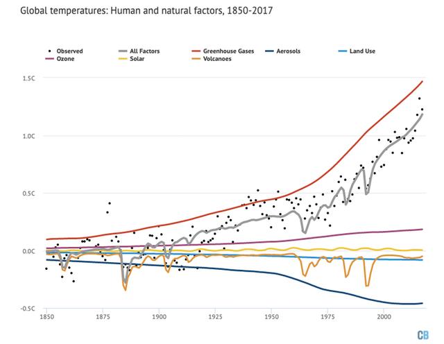 By combining all our scientific knowledge of natural (solar, volcanic, aerosols and ozone) and human-made (greenhouse gases and land-use changes) factors warming and cooling the climate shows that 100% of the warming observed over the last 150 years is due to humans.