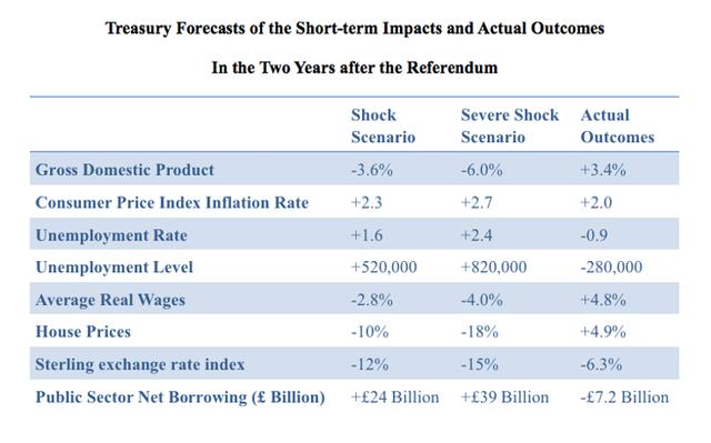 The actual outcomes up to the third quarter of 2018 appear in the last column of the table, and they differ dramatically from the forecasts. In every case, they show that the forecasts were wrong by significant margins. Thus GDP rose by 3.4% rather than fell; inflation was positive but it grew at a lower rate than predicted; unemployment declined by more than a quarter of a million rather than increased; average wages and house prices rose rather than fell; the sterling exchange rate declined, but by much less than predicted; and the public sector borrowing requirement fell rather than rose.