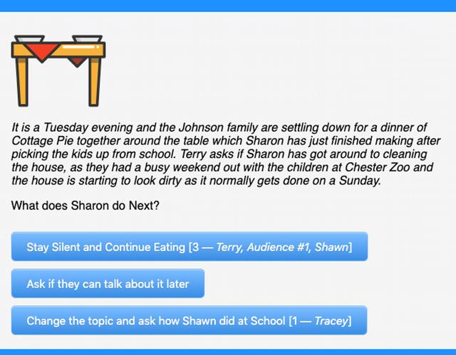 Positive choices by the story’s perpetrator permitted others in the group playing as the children or the female partner to have a wider variety of options. But negative choices by the perpetrator directly restricted the choices of the others, reflecting the impact of coercive and controlling behaviour on other people.