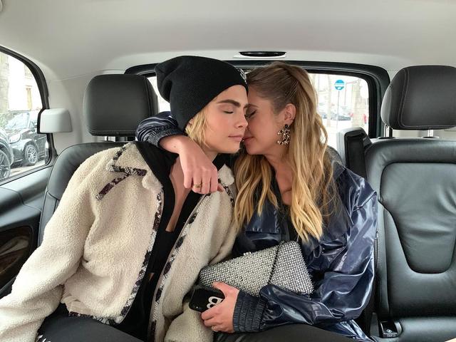 March 5: Following Karl Lagerfeld’s final Chanel show in Paris, stylist Jamie Mizrahi posts a photo of Delevingne and Benson having a “post show cuddle puddle” in the backseat of a car. The emoji Mizrahi includes in the caption — the one of two women kissing — says it all.