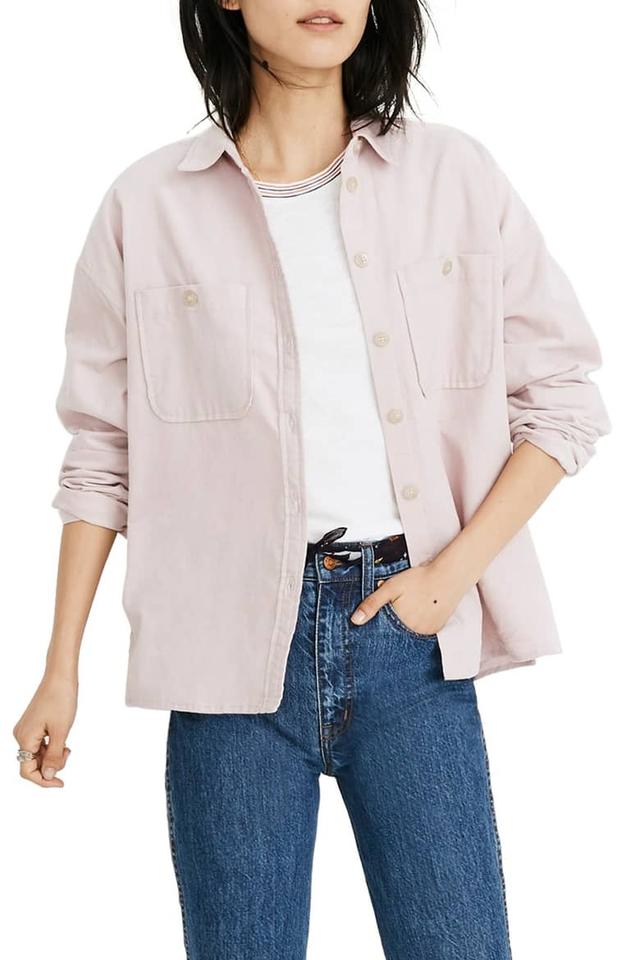 A pale-pink corduroy shirt-jacket that has whiffs of a chore coat.