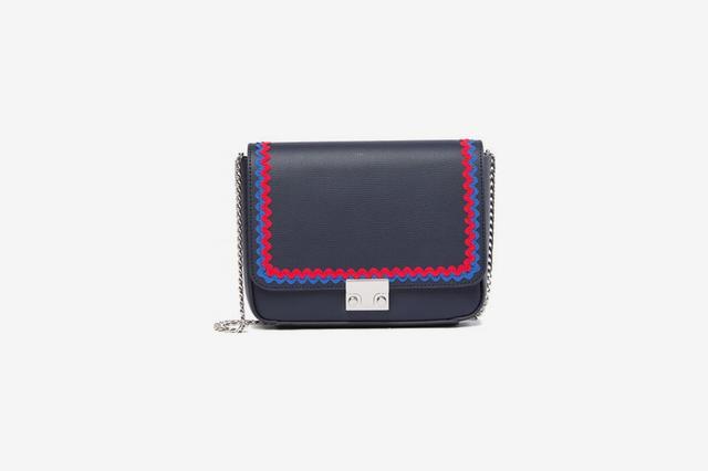 The zig-zaggy blue and red ribbon border of this Loeffler Randall purse is fun without being too too.
