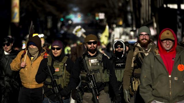 Thousands of people entered the security perimeter around the state capitol, where Northam had banned guns in an executive order, fearing violence. But thousands of others rallied on nearby streets that didn’t fall under the emergency order, many of them carrying assault rifles and wearing tactical gear. Members of the Three Percenter and Oath Keepers militias marched in the streets with their weapons, while other rally-goers cheered one man carrying a large sniper rifle with an orange “Guns Save Lives” sticker affixed to its magazine.