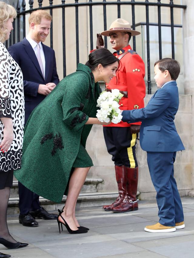 Meghan, who is eight months’ pregnant and was accompanied by her husband, teamed the Aquazzura shoes with a stunning green coat and matching dress by, appropriately, the Canadian label Erdem.