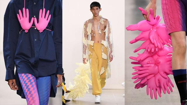 The clothes themselves looked utilitarian—plays on overalls and medical attire, with sudden mocking, satiric flourishes, like pink latex gloves worn on the hand, and then, inflated, on the side of outfits in a mad, frou-frou cluster like feathers. The audience smiled at the clothes, but Private Policy wasn’t joking around. TT