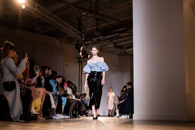 Remember when Meghan Markle accidentally left a tag on the cherry lace dress she wore to Australia? That came courtesy of Self-Portrait, Han Chong’s popular womenswear line, known for its romantic silhouettes and girlish appliqués like bows and polka dots. Those usual suspects are back in his fall collection, which toughened up feminine staples by adding lots of vinyl, cinched weights, and skin cutouts. Think what you’d wear to a leather bar in Greenwich, Connecticut. The only distressing detail: Self-Portrait continued the flattering-for-no one trend of dresses over pants. AD