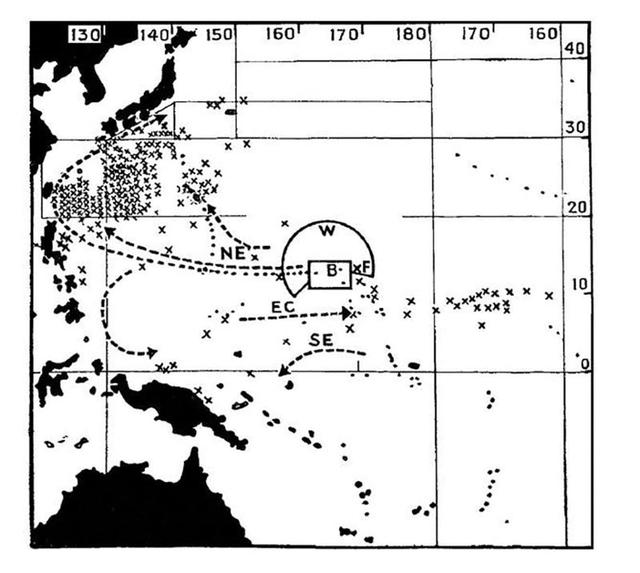 Drawing demonstrating the radioactive contamination areas of fish and water caused by the 1954 nuclear weapon test, Castle Bravo, at Bikini Atoll.