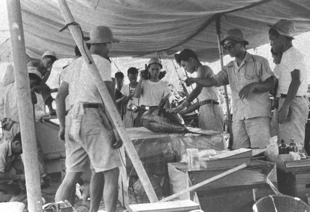 Researchers investigate the radiation level of the fishes caught near Bikini Atoll on the deck of the research ship Shunkotsu Maru in June 1954 at Sea. All 23 crew members of the fishboat were exposed to nuclear fallout of the U.S. Castle Bravo nuclear test while fishing tuna near Bikini Atoll of the Marshall Island on March 1, 1954. Chief radio operator Aikichi Kuboyama died six months later.