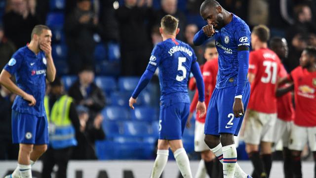 Chelsea’s Croatian midfielder Mateo Kovacic (L) and Chelsea’s German defender Antonio Rudiger (R) react to their defeat on the pitch after the English Premier League football match between Chelsea and Manchester United at Stamford Bridge in London on February 17, 2020. – Manchester United won the game 2-0. (Photo by Glyn KIRK / AFP)