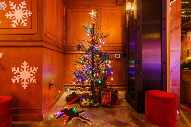 This month, Arthouse Hotel New York City revived its annual holiday pop-up bar. For 2019, the Upper West Side hotel decked its lobby and the adjoining Arthouse Wine Bar with vignettes inspired by the most beloved Christmas films. One window of the bar, for example, features a cutout of Home Alone’s “Wet Bandits” Marv and Harry, peeking in at guests from outside. A replica living room from A Christmas Story complete with a vintage radio, fireplace, the Parkers’ blue couch, and a box marked “fragile” fills a corner of the bar. The Griswold Family’s burnt-to-a-crisp Christmas tree is tucked into another, along with a charred outline of Aunt Bethany’s cat in the carpet. Buddy’s white paper cutouts from Elf line the ceiling over an intimate corner of the lounge.