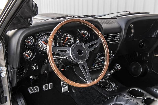 The interior has been meticulously retrofitted with a wood-and-aluminum steering wheel and an all-new cluster with 200-mph gauges. High-back Scat Elite seats with five-point racing harnesses keep the occupants firmly seated when all that horsepower is summoned. The garage even adds air conditioning and a legit JVC audio system, while flip-out DVD navigation and GPS tracking are optional.