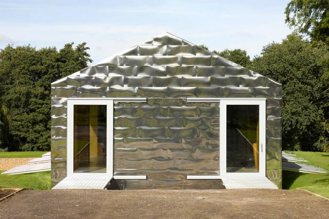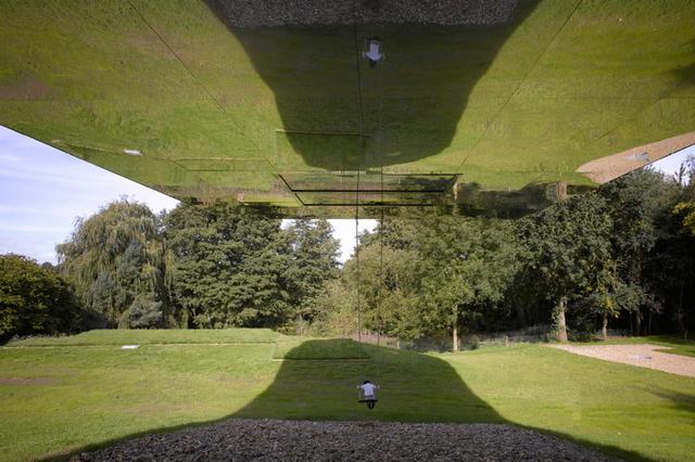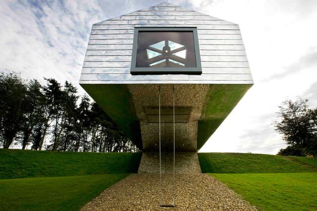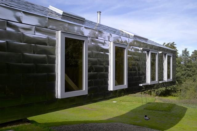 Outside, below the cantilevered section, a swing hangs from the home, beckoning the brave to take a ride if they dare. The underside of the home is also clad in the reflective steel tile, turning the space into an almost Wonderland-like hideaway.