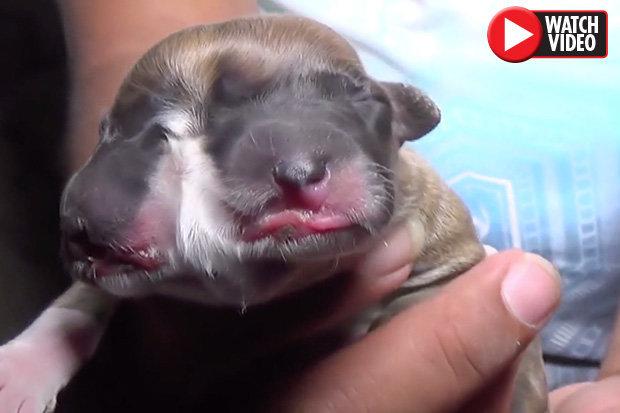 Video footage shows the pooch – born with two noses, two mouths and four eyes – asleep in the arms of its owner.