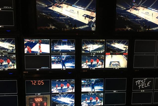 For almost every college network broadcast, the production crew arrives at least six hours prior to tip off. For today’s game, we have a crew of 24 people plus two engineers. Over half of those arrive six hours early to help unload the truck and begin set-up on the court. Our two utilities are stringing out cables and setting up our announce booth monitors while the camera guys begin to set up their cameras. Our audio and video guys are making sure their equipment is plugged in correctly at the patch panel inside the arena and the panel at the truck. All of this happens while Gonzaga goes through their pre-game walkthroughs and scouting reports on the court.
